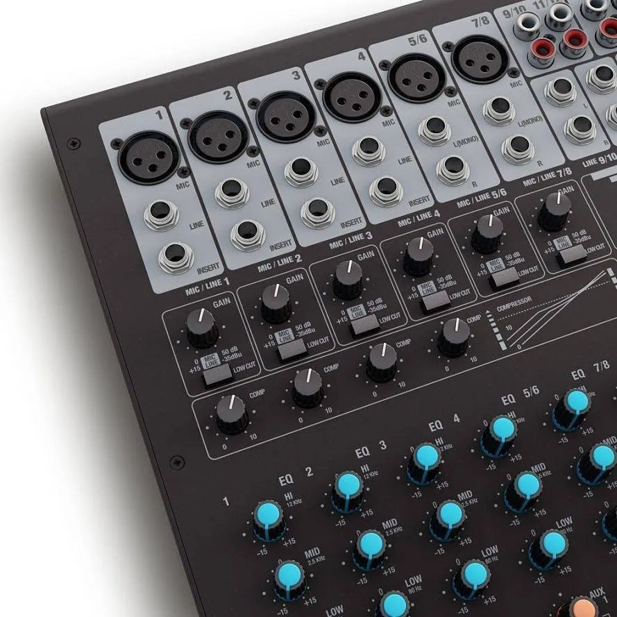 Se pueden procesar cuatro canales de micrófono por separado utilizando el compresor incorporado para un control efectivo de la dinámica; dos más se pueden usar alternativamente como canales de línea estéreo. Los otros canales estéreo están equipados con ecualizadores de 2 bandas.